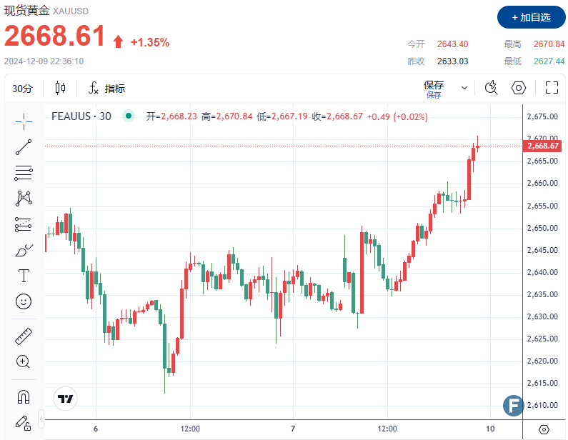 截至发稿,现货黄金上涨1.35%,报每盎司2668.61美元。