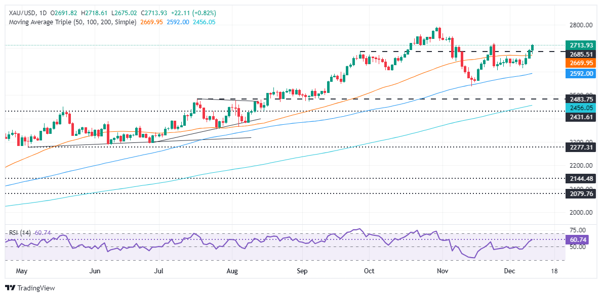 FXStreet分析师Christian Borjon Valencia指出,金价继续上涨,突破2700美元/盎司大关,但仍低于11月25日的峰值2721美元/盎司。正如相对强弱指数(RSI)所描绘的那样,势头仍然看涨。因此,金价前景仍偏向看涨。