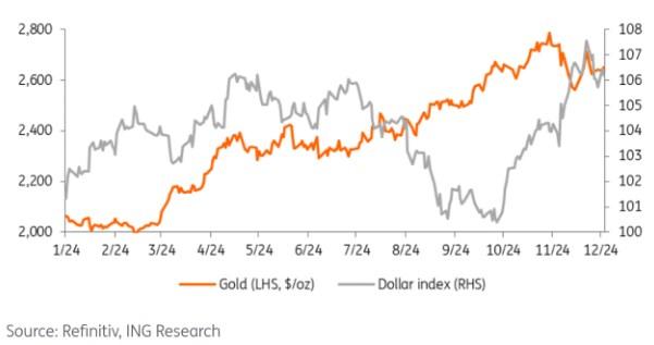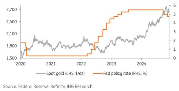 ING预计,2025年第一季度和第二季度现货黄金均价将为每盎司2800美元,然后在第三季度回落至2750美元,第四季度回落至2700美元,2025年均价为每盎司2760美元。