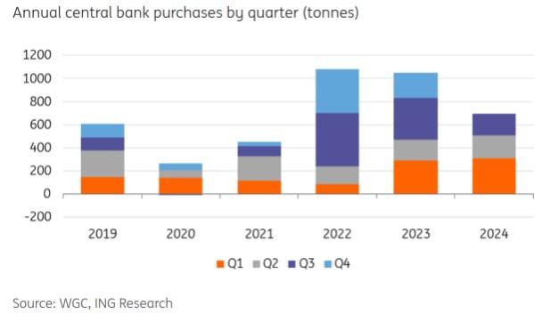 ING预计,未来一年央行黄金需求将保持强劲,这将继续支撑处于历史高位的金价。