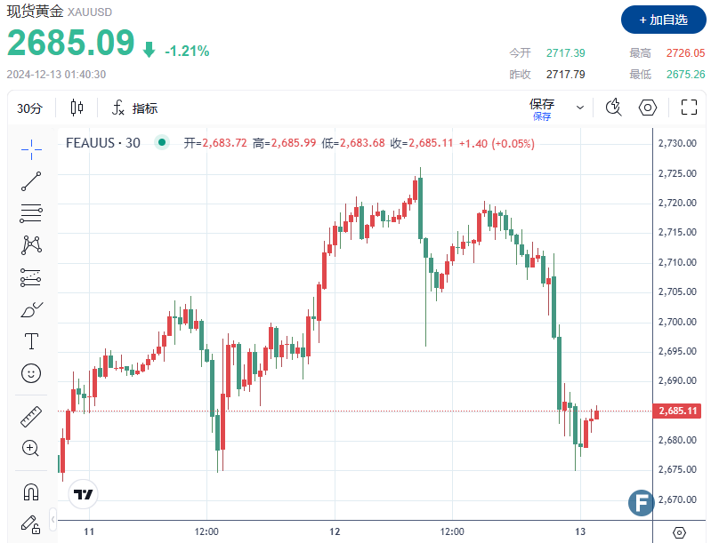 金价较日高一度暴跌超50美元、失守2680,创两周多以来最大盘中跌幅。截至发稿,金价现报2685美元/盎司。