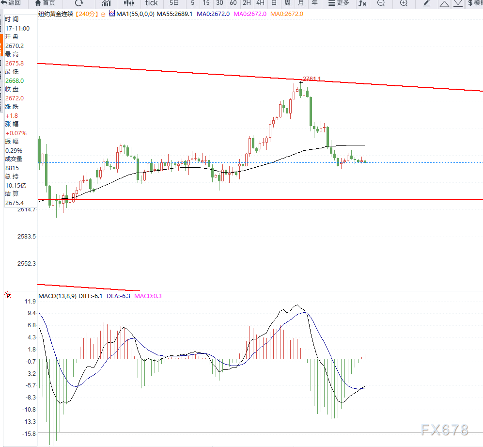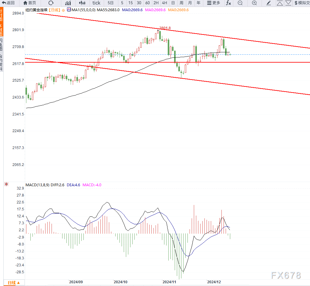周二(12月17日)欧盘时段,COMEX黄金交投于2669美元附近,基本面上市场在等待美联储利率决议之后的方向选择,目前美元指数并未突破箱体压力,日内重点留意美国零售数据。