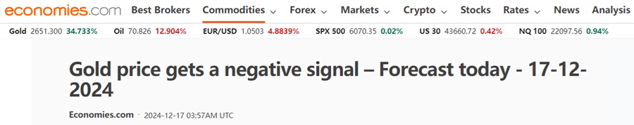 24K99讯 周二(12月17日)亚市尾盘,现货黄金短线突然出现一波跌势,金价自2655美元/盎司附近水平回落,刚刚最低跌至2646.49美元/盎司。知名财经资讯网站Economies.com周二最新撰文,对日内黄金技术前景进行分析。