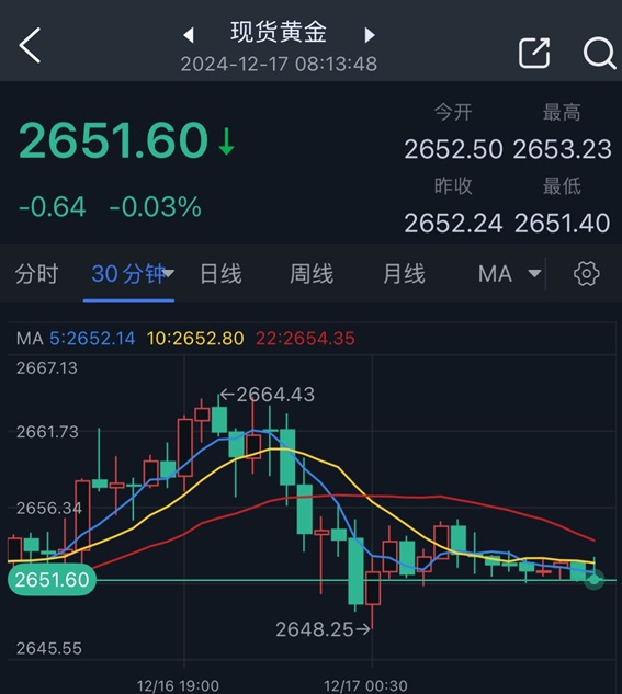 纽约时段早盘,金价一度触及2664.43美元/盎司,但随后金价大幅下挫,最低跌至2648.25美元/盎司。