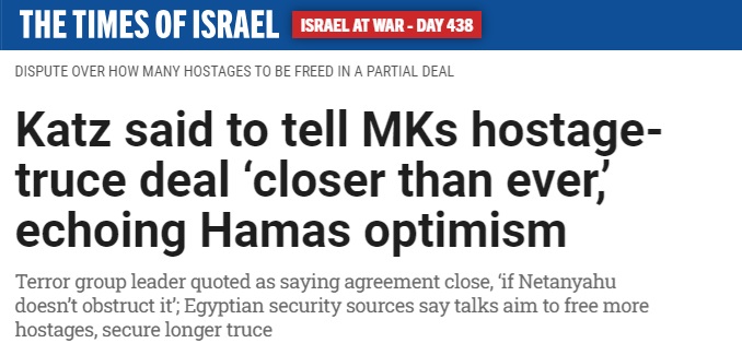 据《以色列时报》周一报道,以色列国防部长卡茨(Israel Katz)周一对以色列议会议员说,以色列“比以往任何时候都更接近”与哈马斯达成协议,释放在加沙被关押的人质。卡茨对未来几周达成协议的可能性非常乐观。