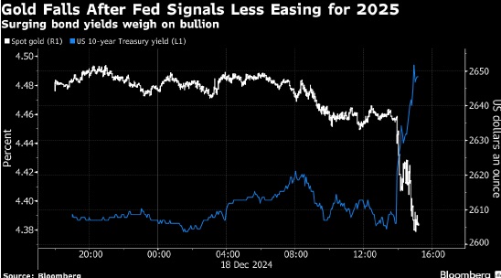 24K99讯 周三(12月18日),美联储如预期般降息并预测2025年政策放松幅度缩小,美联储主席鲍威尔称进一步降息的门槛可能会更高,这刺激美元和美债收益率飙升,现货黄金暴跌逾2%至一个月低点。