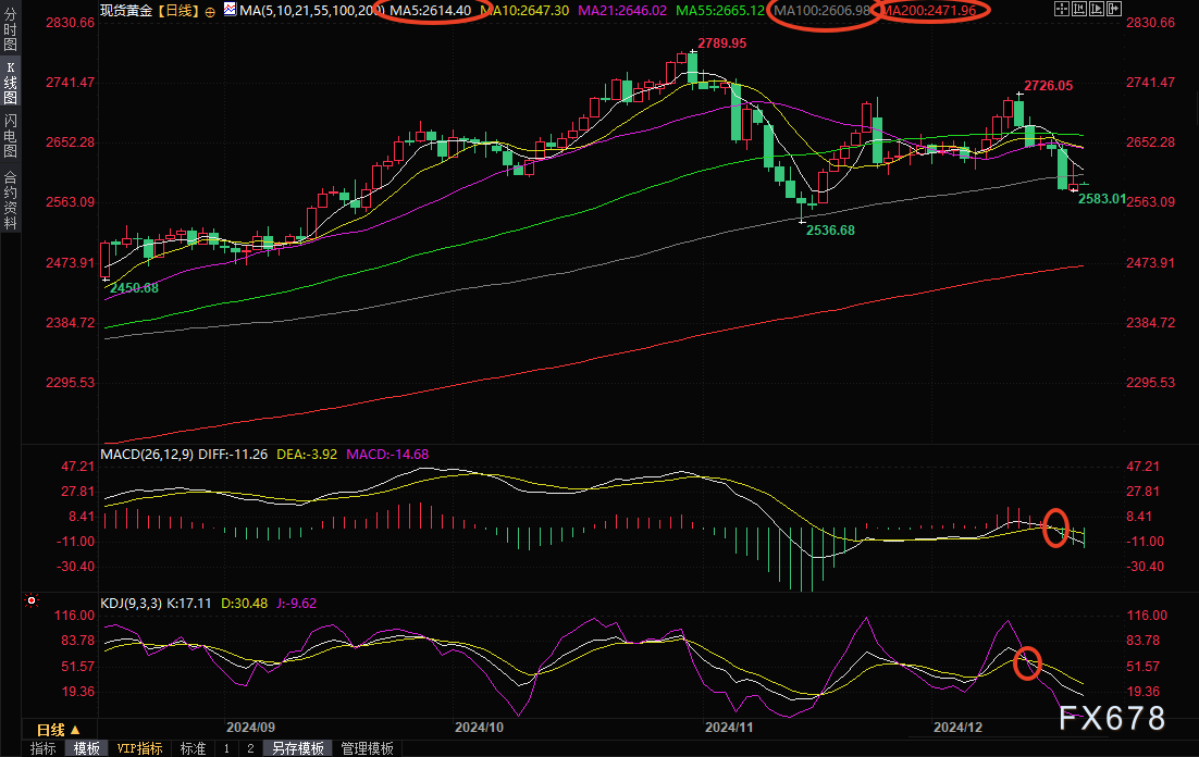 技术面来看,金价连续两天收盘于100日均线和2600关口下方,周四反弹受阻后回落暗示上方卖盘较强,MACD和KDJ死叉运行,金价后市面临进一步下行风险,初步目标看向11月14日低点2536.68附近位置,长线目标有望看向200日均线附近,目前在2471.97附近。