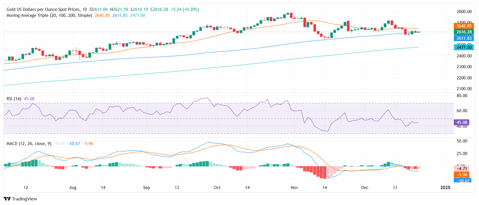 FXStreet分析师Patricio Martín指出,从技术角度来看,黄金面临重大阻力。各项指标显示势头疲弱。金价一度测试100日简单移动平均线(SMA)支撑位2610美元/盎司,这是近几个月来黄金的关键水平。