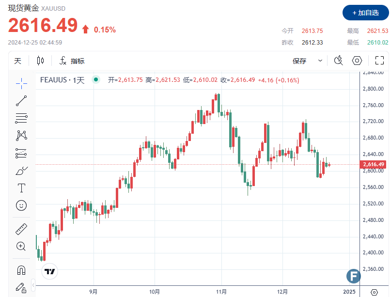 截至发稿,现货金上涨 0.15% 至每盎司 2,616.49 美元。