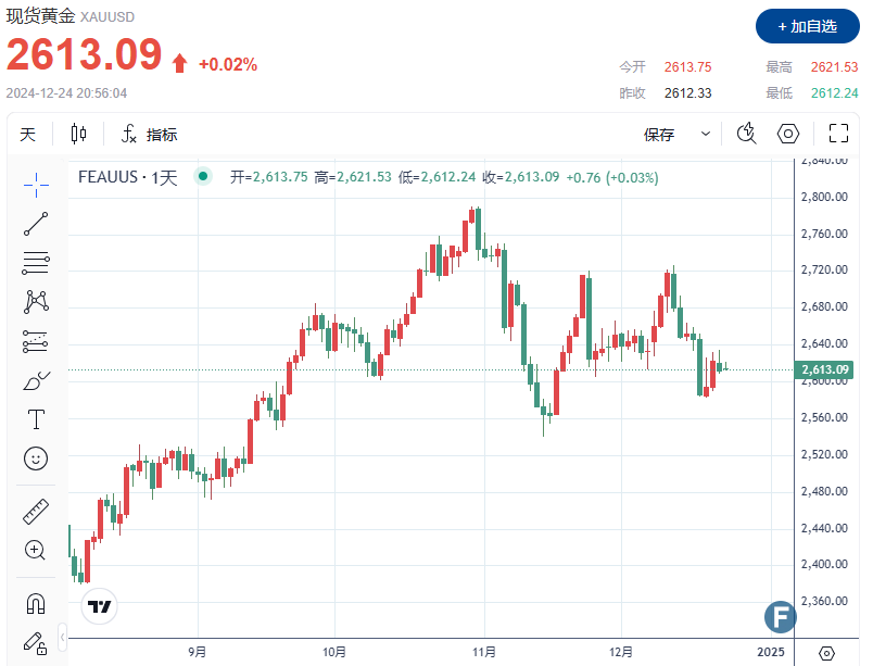 周二(12月24日),黄金价格在平静的假期交易中上涨后回落,而投资者的注意力集中在美联储明年的利率策略和当选总统唐纳德特朗普未来的关税政策上。