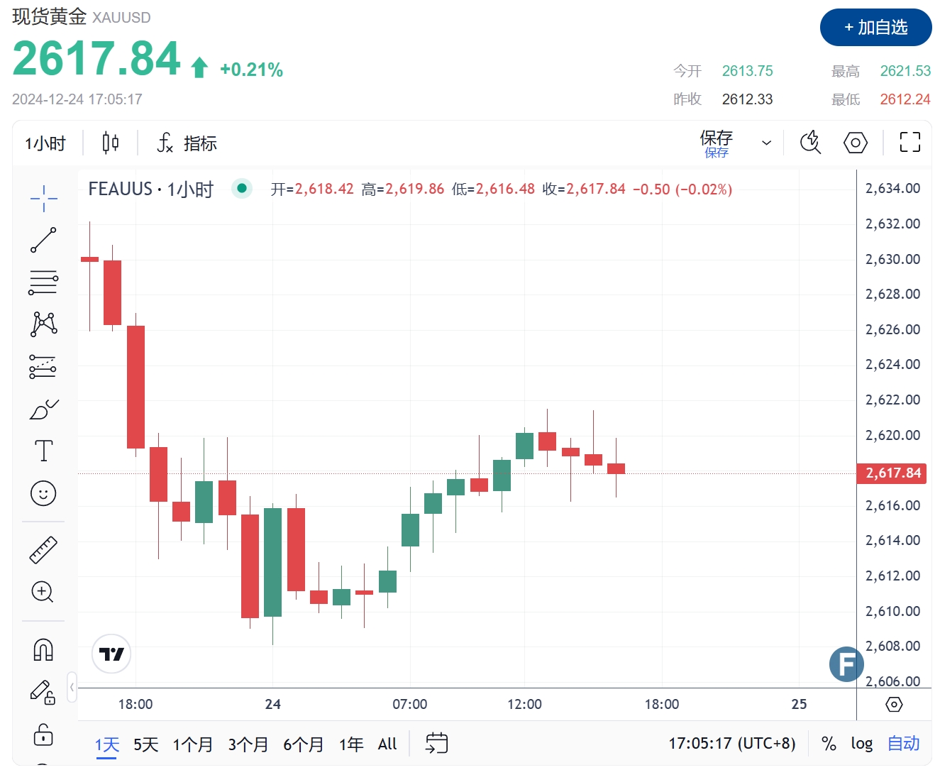 24K99讯 周二(12月24日),黄金价格微幅反弹至2617美元,以色列承认暗杀哈马斯领导人,但鹰派阻拦贵金属反弹,美国国债收益率上升,提振美元并对无法提供债券般收益的黄金造成挑战。技术分析指出,金价突破关键枢轴点2633.32美元,将有望恢复看涨动力。