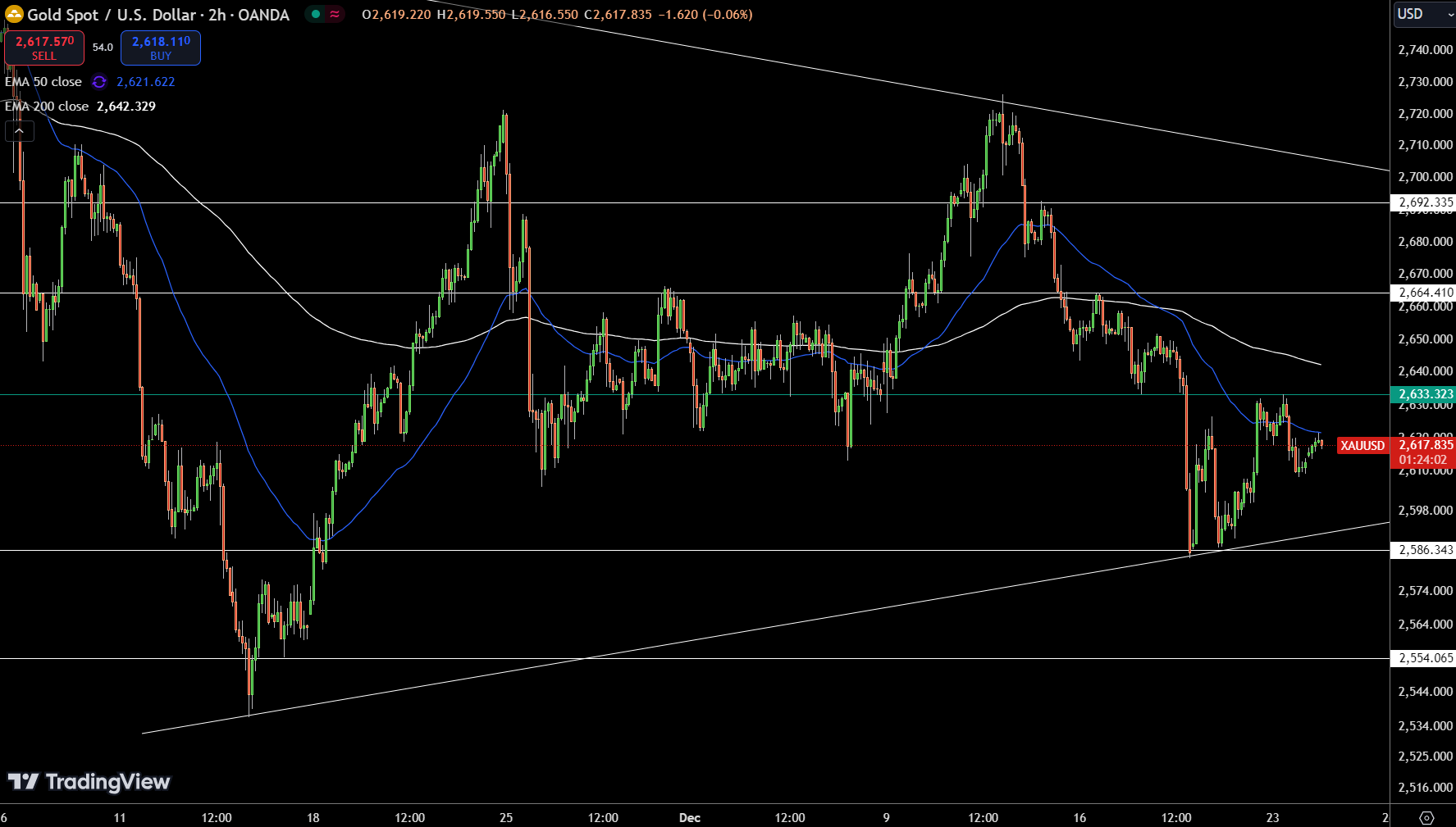 下行方面,即时支撑位在2586.34美元,突破该水平可能推动金价跌向2554.07美元。50日均线在2621.62美元,与当前价格紧密相关,增强了盘整。黄金的走向取决于它能否突破2633.32美元以维持看涨势头,否则如果未能守住支撑位,则面临回落。