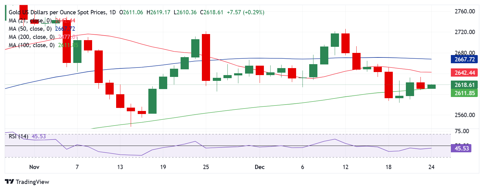 24K99讯 周二(12月24日)欧市早盘,现货黄金维持日内反弹走势,目前金价位于2621美元/盎司附近。FXStreet高级分析师Dhwani Mehta周二撰文,对金价技术走势进行分析。