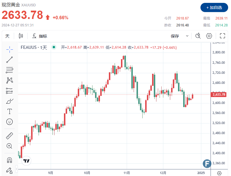 FX168财经报社(欧洲)讯 周四(12月26日),黄金价格上涨,受圣诞假期后清淡交投中避险需求的推动,市场正在等待特朗普政府上台后美国经济的表现,以及美联储2025年的利率策略。