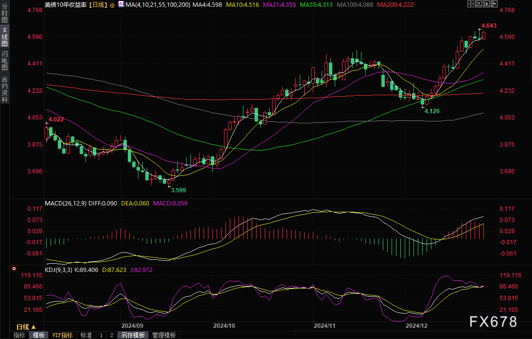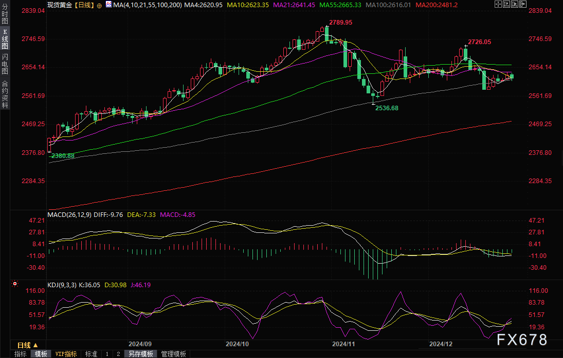 现货黄金上周五(12月30日)收盘下跌0.48%,收报2620.96美元/盎司,勉强守在100日均线2616.01上方,因美国国债收益率上升,在假期稀少的交投中削弱了非孳息黄金的吸引力,市场关注当选总统特朗普的回归,以及他的通胀刺激性政策对美联储2025年前景的潜在影响。