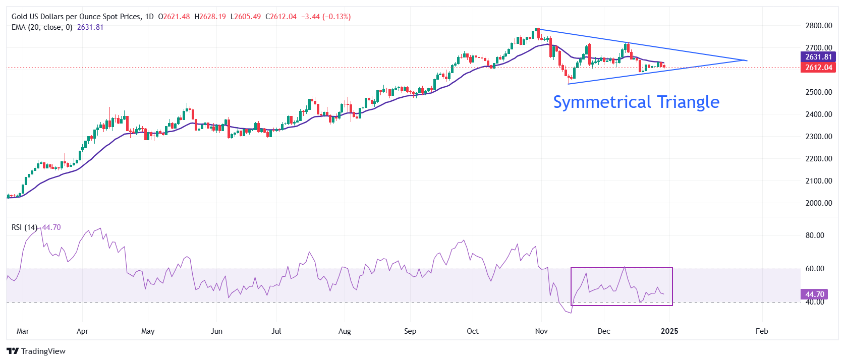 FXStreet分析师Sagar Dua指出,从黄金日线图来看,黄金价格在对称三角形内交易,表现出剧烈的波动性收缩。2630美元/盎司附近的20日指数移动平均线(EMA)限制金价反弹走势,显示出横盘趋势。