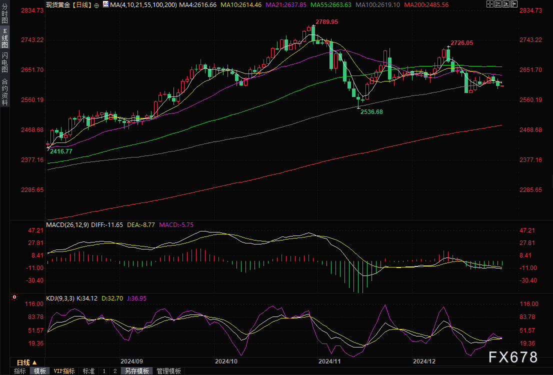 周二(12月31日)亚市盘初,现货黄金窄幅震荡,目前交投于2606.57美元/盎司附近。金价周一在淡静交投中下跌0.6%,盘中一度失守2600关口至2595.98美元/盎司,收报2605.62美元/盎司,低于100日均线2619附近关键位置,美元指数一度创一周新高,令金价承压。