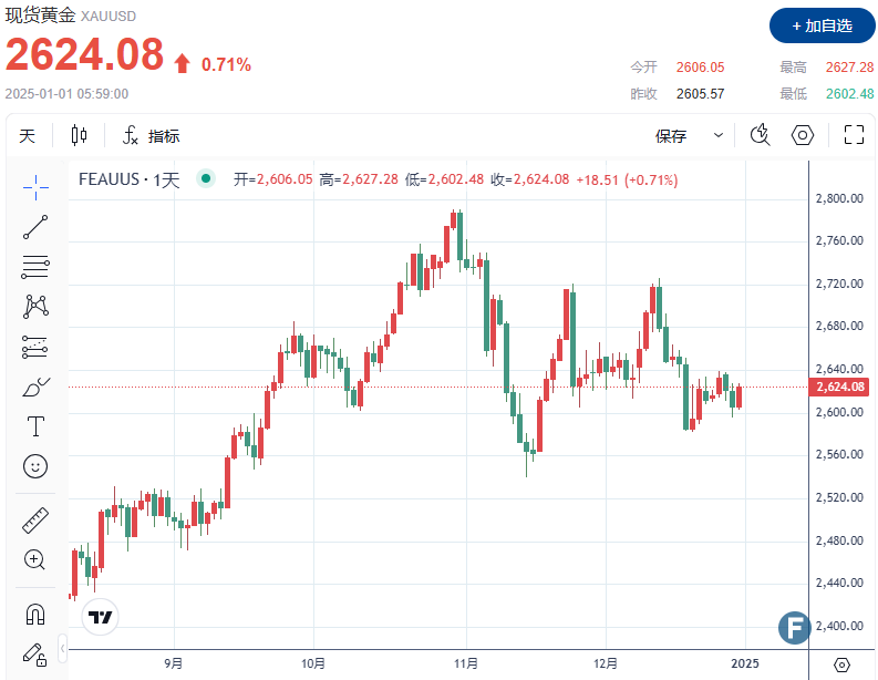 周二(12月31日),截至发稿,现货黄金上涨 0.71% 至每盎司 2,624.08 美元。