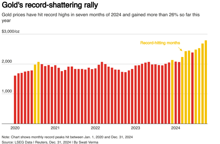 央行强劲购买、地缘不确定性和货币政策宽松推动避险黄金在 2024 年创下历史新高,并在 10 月 31 日创下 2,790.15 美元的历史新高。