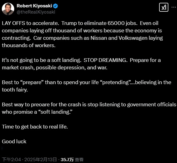 2月13日,清崎在社交媒体平台X上发布了一篇文章,告诫人们不要对“软着陆”抱有期望,敦促个人为严重的经济衰退做好准备。他说:“裁员将加速。特朗普将削减6.5万个工作岗位。就连石油公司也因为经济萎缩而解雇了数千名工人。日产(Nissan)和大众(Volkswagen)等汽车公司解雇了数千名工人。”