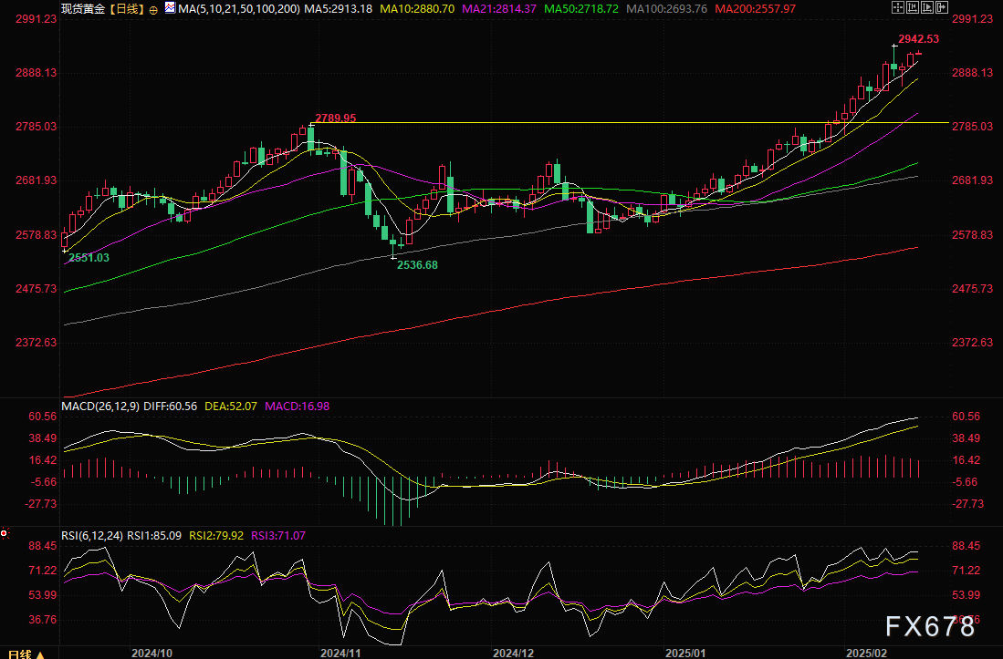 周五(2月14日)亚洲时段,现货黄金延续涨势,截止8:00,最高触及2932.24美元/盎司,逼近周二创下的历史高点2942.53美元/盎司。金价周四上涨0.83%,收报2928.26美元/盎司,因美国总统特朗普公布了对美国进口商品征收对等关税的计划,加剧了全球贸易担忧。另外,美国通胀数据显示核心PCE将下降,美元指数大跌0.89%,录得近两个月最低收盘价,美债收益率也从近三周高位大跌近2%,给金价提供上涨动能。