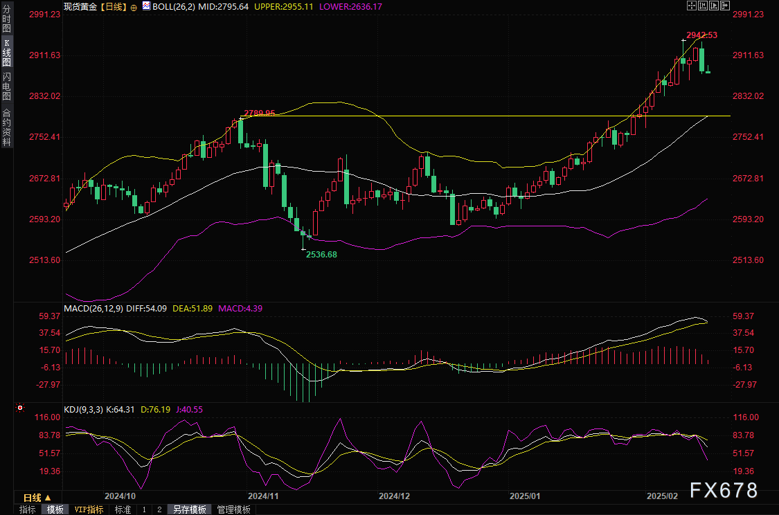 周一(2月17日)亚市早盘,现货黄金反弹受阻,早些时候一度上涨0.37%,至2893.64美元/盎司,但很快回落,目前交投于2881美元/盎司附近,继续受多头获利了结拖累,另外,特朗普称很快与普京会面,也令避险情绪有所减弱。金价上周五下跌逾1.55%,受累于获利了结,但周线势仍连续第七周上涨,美国总统特朗普推动对等关税后投资者担忧出现全球贸易战。