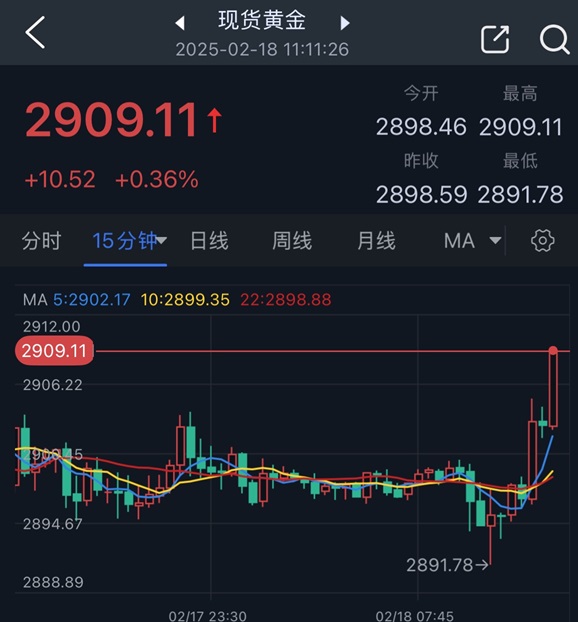 北京时间11:11,现货黄金报2909.11美元/盎司。