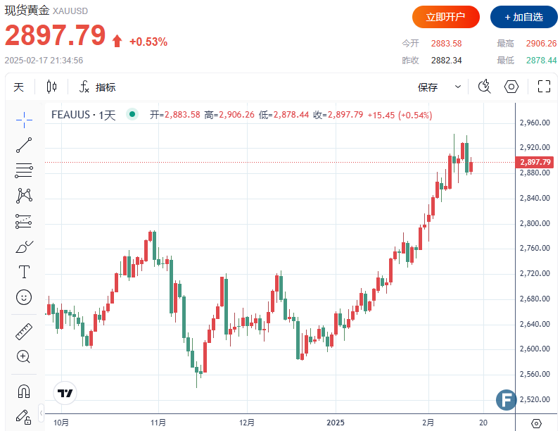 截至发稿,现货黄金上涨0.53%,报2897.79美元/盎司,盘中上破2900美元,此前一周曾创下2942.70美元/盎司的历史新高。