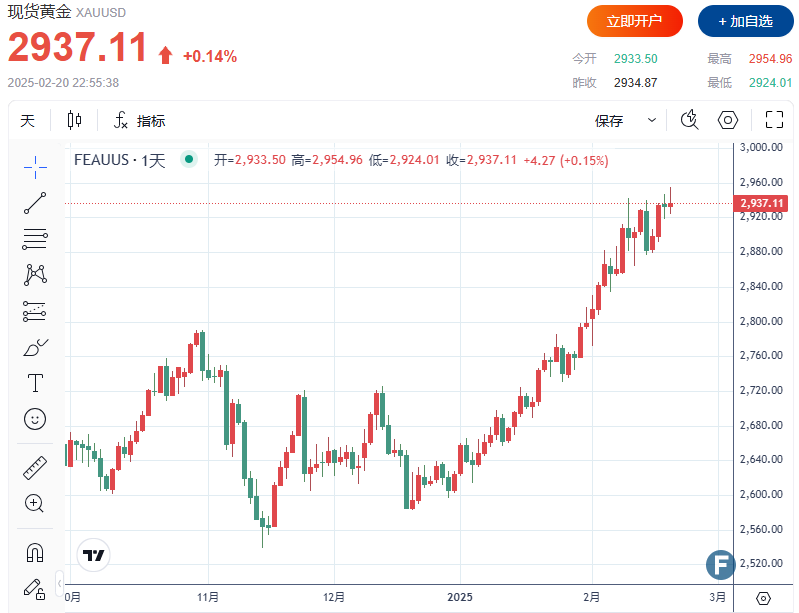 截至发稿,现货黄金上涨0.14%,报2,937.11美元/盎司,盘中最高触及2,954.96美元,这是今年第十次创下历史新高。