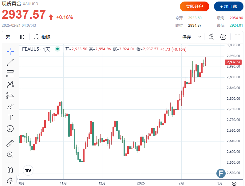 截至发稿,现货黄金上涨0.16%,至2,937.57美元/盎司。盘中最高触及2,954.96美元,为今年第十次刷新历史纪录。