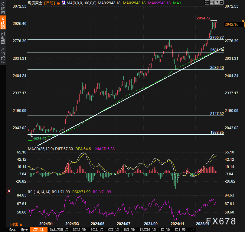 周四(2月20日),现货黄金价格再度攀升,成功突破2947美元/盎司,刷新历史最高纪录。市场普遍认为,全球地缘政治和贸易紧张局势的加剧,将继续推动黄金价格的上涨趋势。尽管技术面上,金价已经接近超买区域,但多方力量依然占据主导,短期内黄金的上涨动能仍然强劲,市场的关注点也在于金价是否能在不久后突破3000美元/盎司大关。