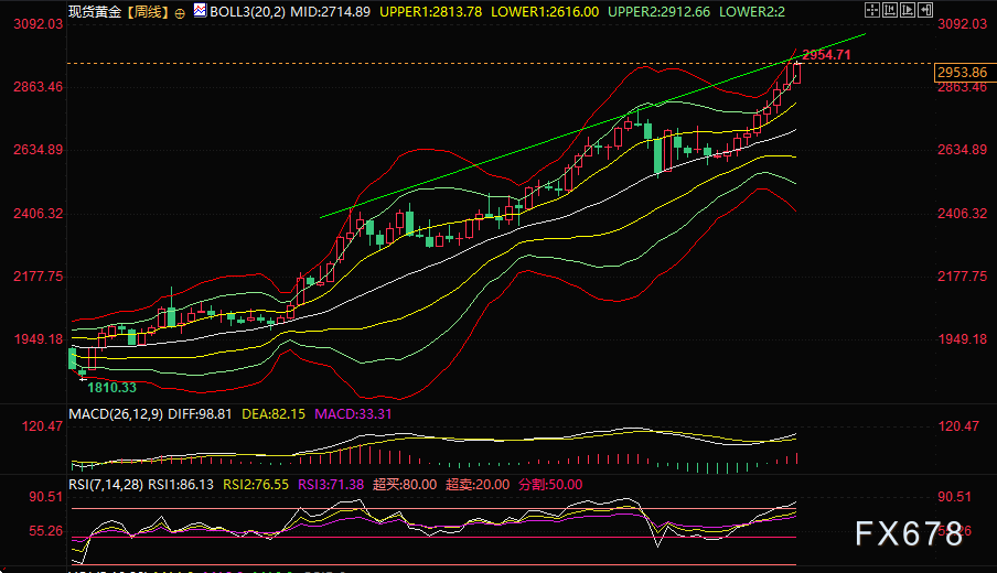 技术面看,周图及以上级别的RSI全部是处在超买区域,但强势上涨趋势中,这是常见现象。目前上涨趋势的结构是良好的,重点是防御超买或超买背离后的回调。在金价已经升破2950创历史新高至2954.71美元/盎司之际,目前重点关注的阻力看2980-2990区域,如下图,2980是周线绿色趋势线的当前切入位,而疯狂行情通常会溢出一些,但3000整数关口又可能不会一次性到达,因此,本周内重点关注的阻力就是看2980-2990区域。