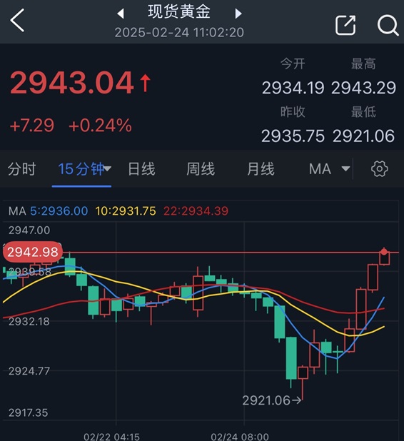 北京时间11:02,现货黄金报2943.04美元/盎司。