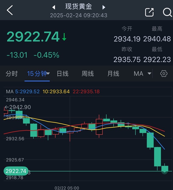 北京时间09:20,现货黄金报2922.74美元/盎司。