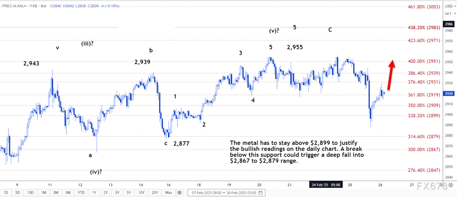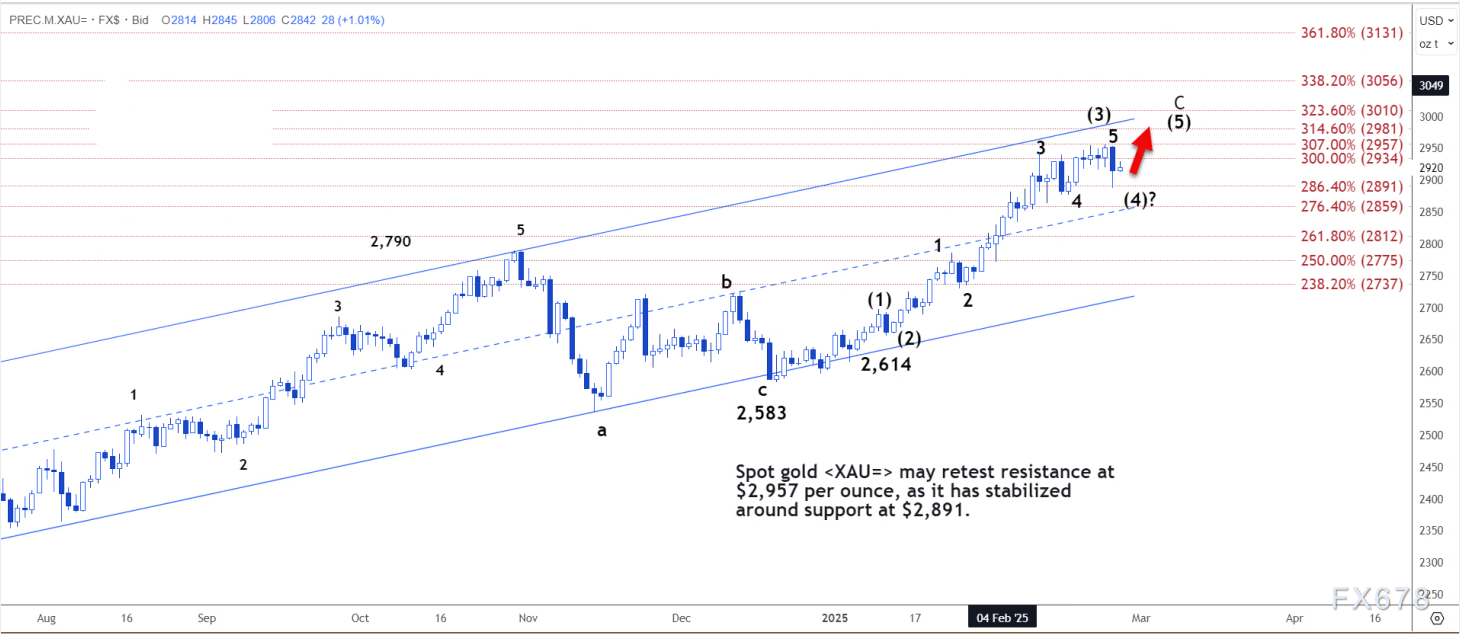 假设 (4) 浪已在 2891 美元附近结束并非毫无根据。突破 2934 美元将是 (5) 浪展开的早期迹象。