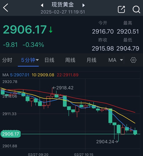 北京时间11:19,现货黄金报2906.17美元/盎司。