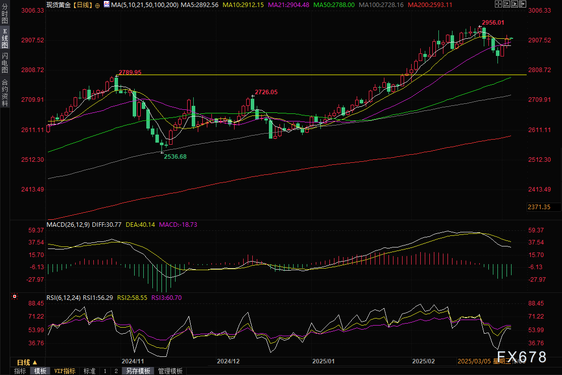 周三(3月5日)亚市盘初,现货黄金高位窄幅震荡,目前交投于2915.90美元/盎司附近。在美国总统特朗普征收新关税后贸易冲突升级的背景下,美元走软至近三个月低位,避险需求增加,推动金价周二上涨0.84%(约24美元)至2917.56美元/盎司,盘中最高曾触及2927.66美元/盎司,为连续两个交易日上涨。