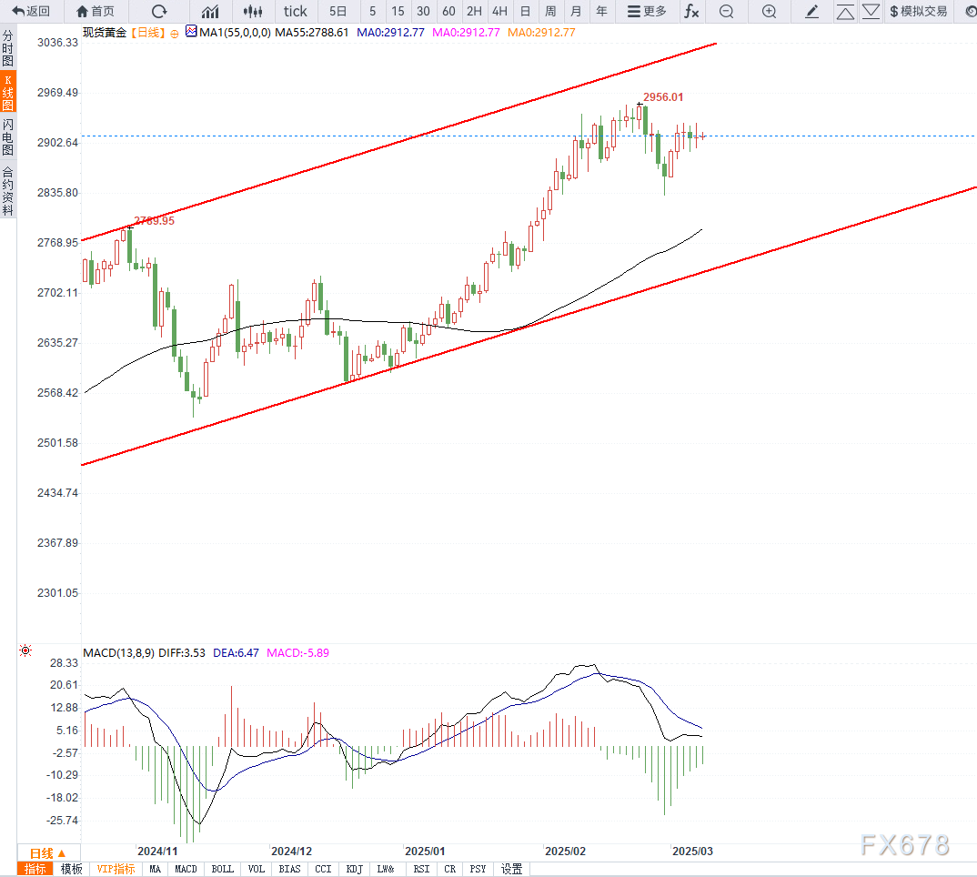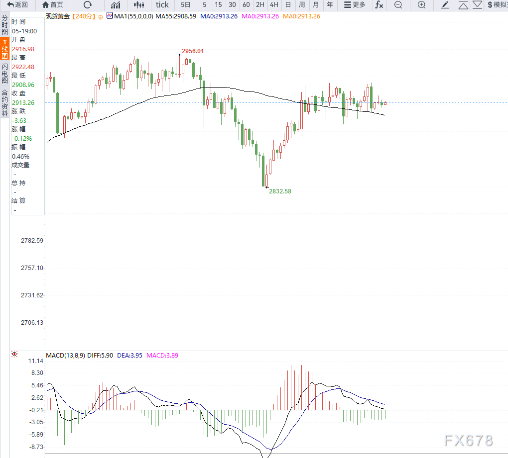 日线级别箱体上沿压力2930美元不破,则存在二次回落的可能性,下方支撑2900美元,跌破则加速下行。