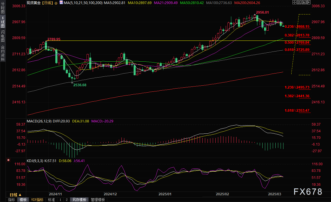 周二(3月11日)亚洲时段,现货黄金延续跌势,目前交投于2883.09美元/盎司附近。隔夜金价下跌0.79%,失守2900关口,盘中一度刷新近一周低点至2880.19美元/盎司,泽连斯基访问沙特,美国对美乌官员会谈持乐观态度,市场对地缘局势的担忧情绪降温;另外,美国股市市值蒸发四万亿美元,增加了投资者的持币需求,进一步推动黄金多头获利了结。