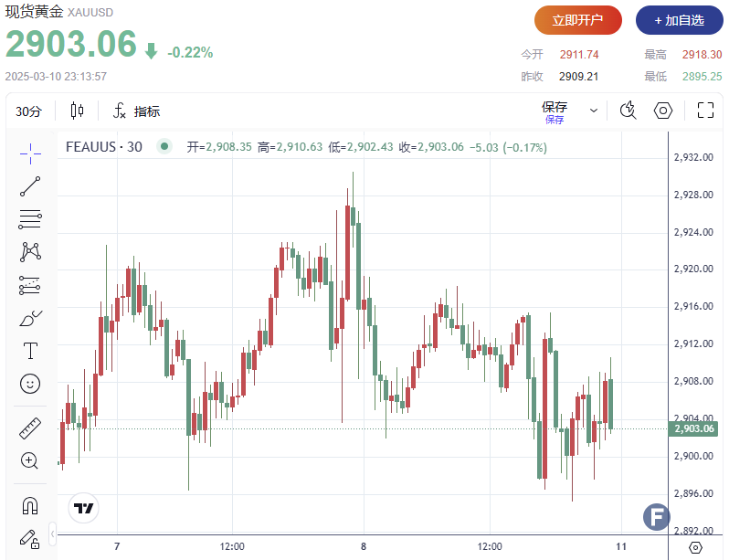截至发稿,现货黄金下跌 0.22%,报 2,903.06 美元/盎司。
