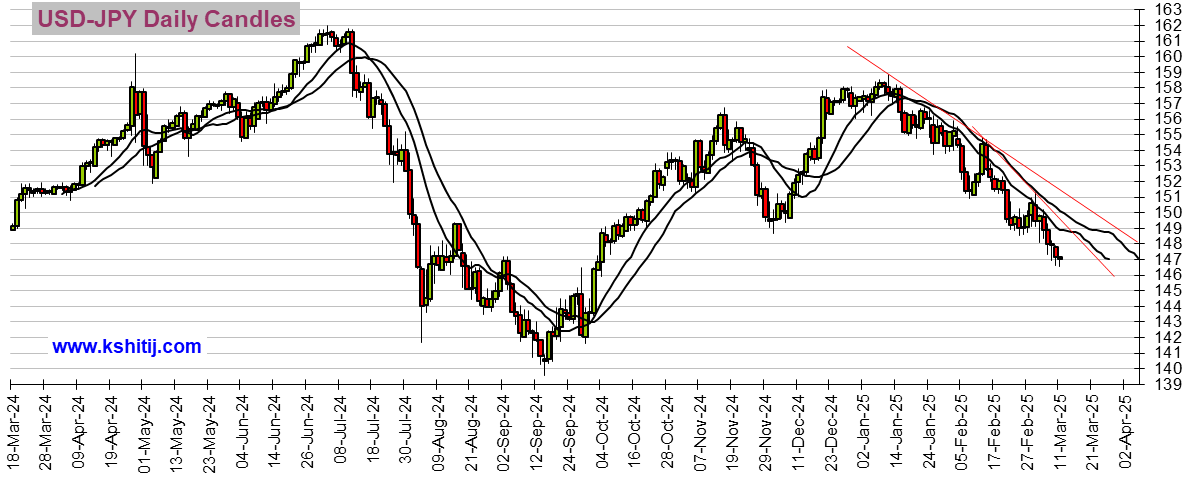 美元/日元继续下跌,可能会测试145-144的支撑区域,然后尝试反弹。
