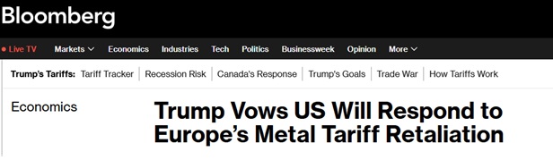 特朗普周三在白宫被记者问及是否会报复时表示:“我当然会做出回应。你看,欧盟就是为了占美国的便宜而成立的。”
