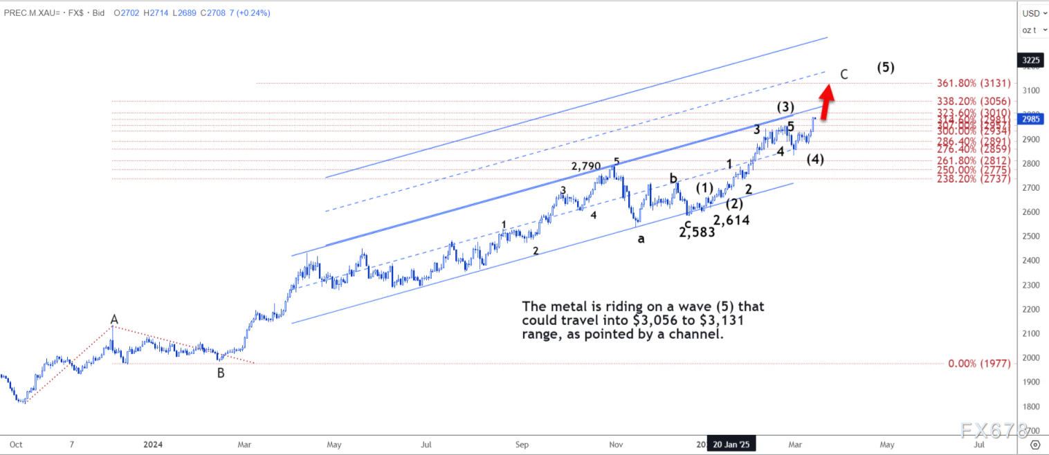 跌破 2979 美元可能引发跌至 2966 美元。日线图上,黄金走势处于 (5) 浪,可能进入 3056 美元至 3131 美元区间,如通道所示。
