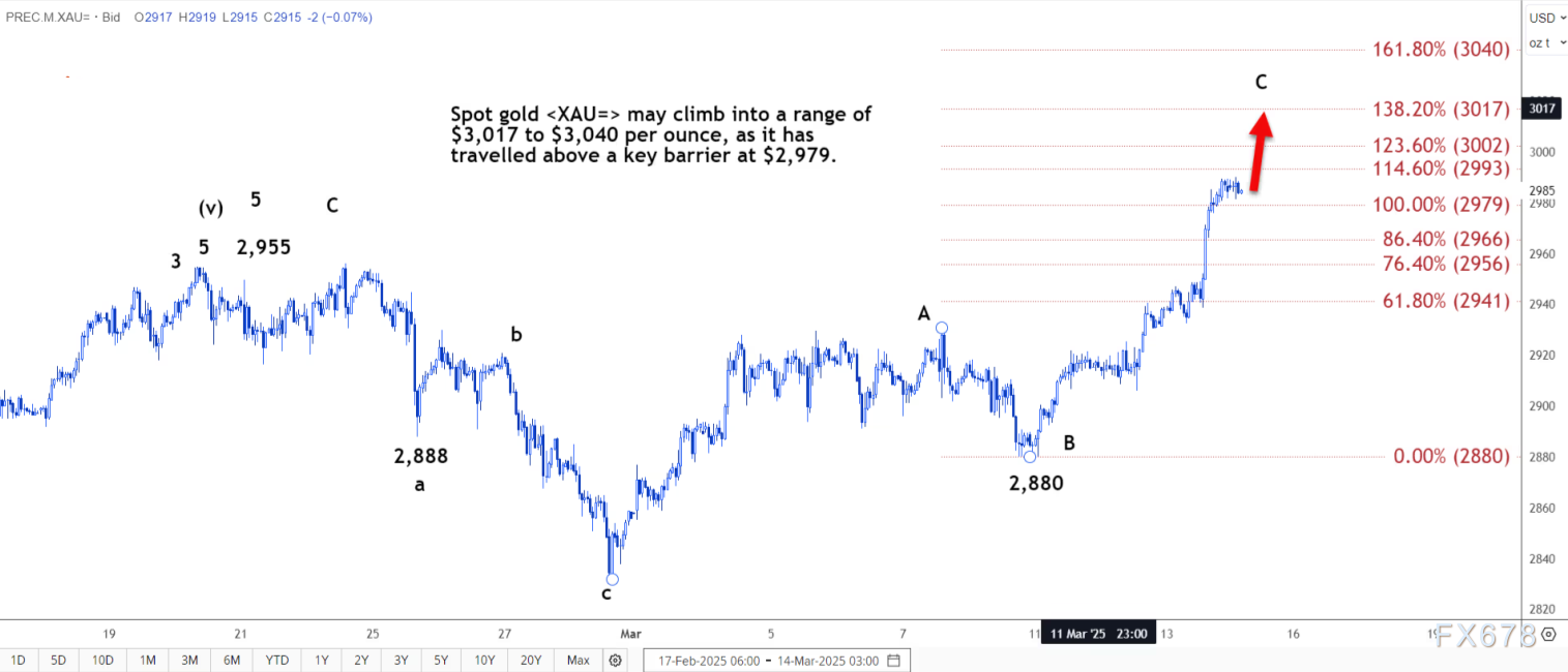 路透技术分析师周五指出,现货黄金可能攀升至每盎司 3017 美元至3040 美元的区间,因为其已经突破了 2979 美元的关键屏障。