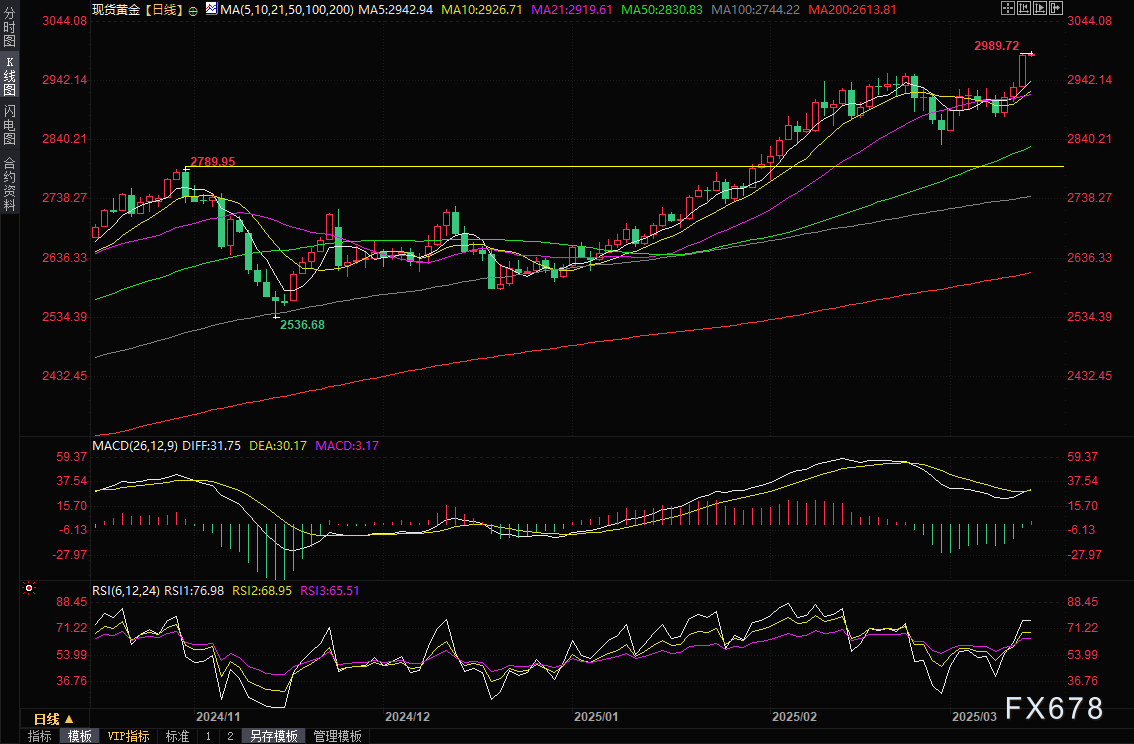 周五(3月14日)亚市早盘,现货黄金高位震荡,目前交投于2986.08美元/盎司附近。金价周四飙升逾50美元,收报2988.64美元/盎司,周五小幅刷新纪录高位至2989.72美元/盎司,接近每盎司3000美元这一关键里程碑,受关税不确定性上升和对美联储放宽货币政策的押注推动。