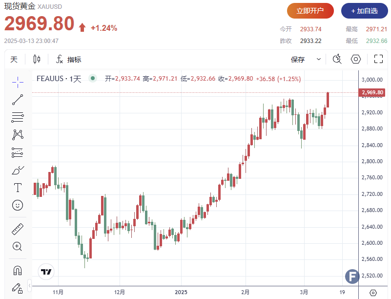 截至发稿,现货金上涨 1.24% 至每盎司 2,969.80 美元,盘中一度至日高 2,971.21美元 ,超越 2 月份创下的 2,956.15 美元的历史高点。