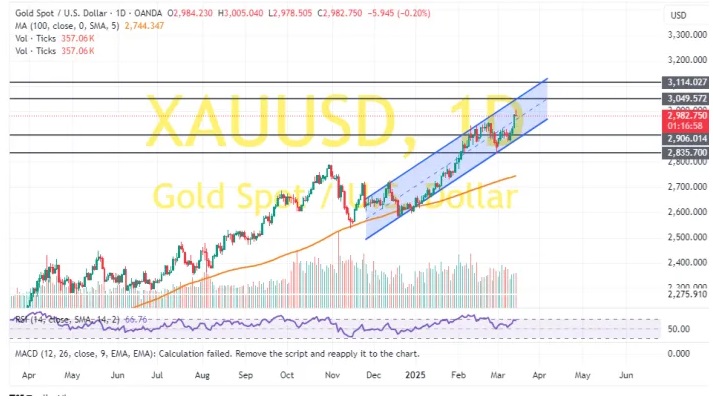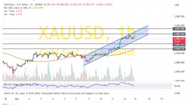 24K99讯 周一(3月17日)亚市开盘后,现货黄金持续走强,金价最高触及2994.17美元/盎司,日内攀升10美元。知名财经网站FXDailyReport分析师Nicholas Kitonyi撰文,对黄金后市走势进行分析。
