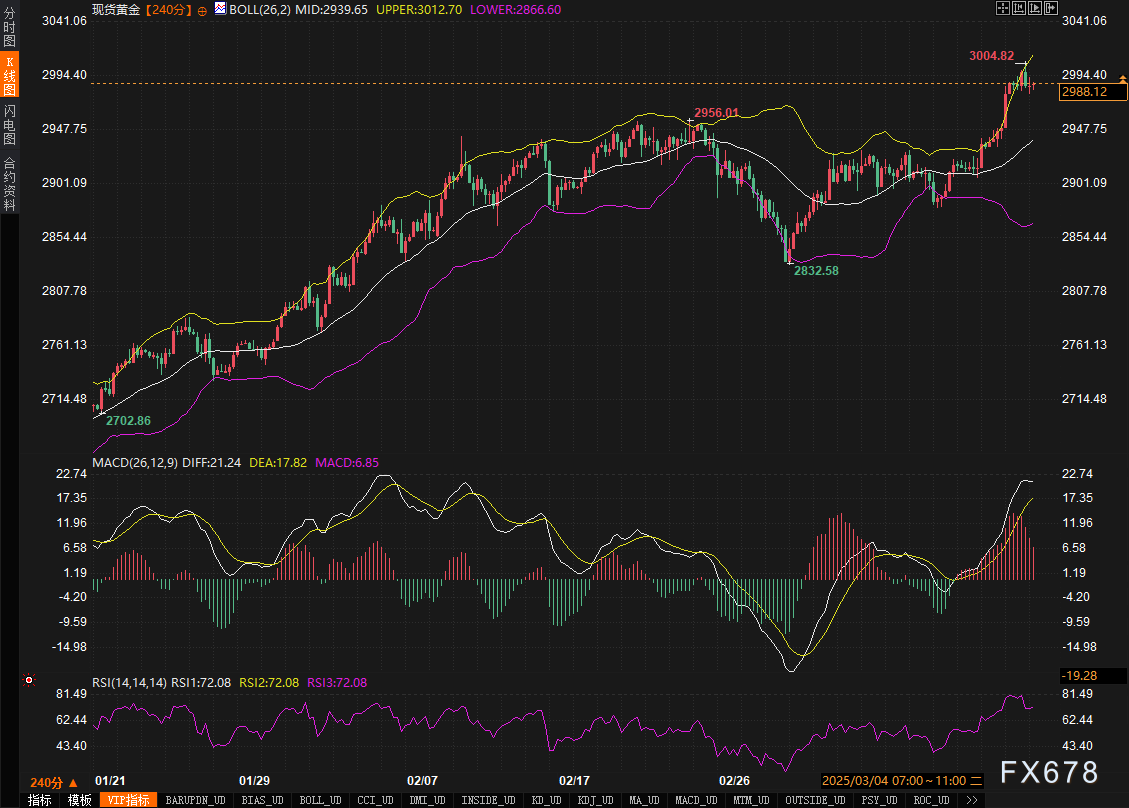 从黄金4小时图来看,布林带通道:当前布林带上轨位于3012.71美元,中轨2939.65美元,下轨2866.58美元。价格突破上轨后短暂回落,但仍紧贴上轨运行,通道开口持续扩张,显示波动率放大且趋势延续性强。若价格站稳3000美元上方,上行目标可看至3050-3100美元;反之若回落至中轨下方,可能触发技术性抛压。