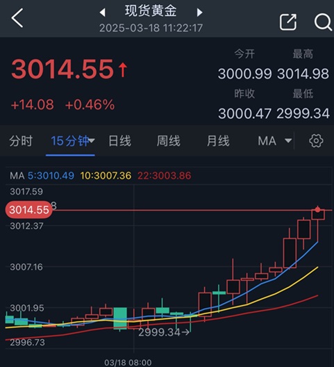 24K99讯 周二(3月18日)亚市盘中,现货黄金短线持续走高,金价刚刚触及3014.98美元/盎司,再创历史新高。在上一交易日强势走高后,金价周二日内再度大涨近15美元。