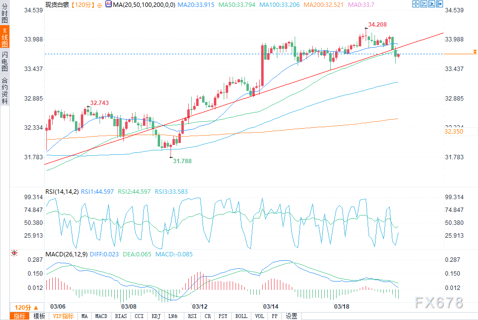 白银价格跌破了其上涨趋势线,交易员应关注其是否能突破34.208美元或跌破33.70美元,以确定下一步的走势方向。